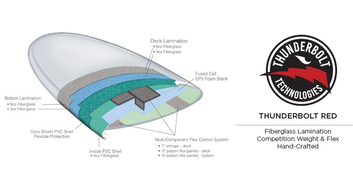 To reinforce durability without sacrificing feel, Thunderbolt uses a core shield PVC layer for flexible protection. Combined with carbon fiber and fiberglass in the deck, rails, and bottom, these boards not only outperform—but also outlast—most PU and pop-out epoxy boards on the market.